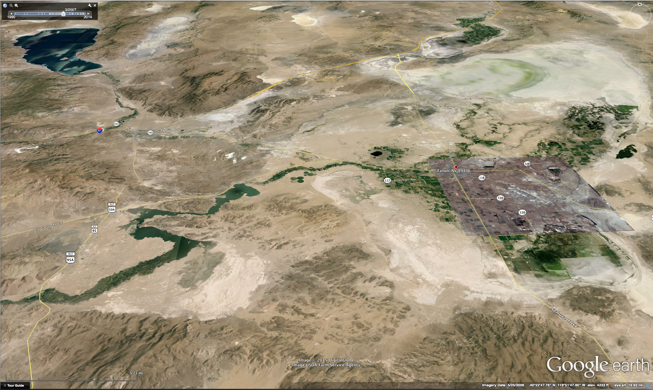 The two Google Earth images below demonstrate how dry western Nevada has become. The top image is from 2006 and the image below it is 2013. To download the full-sized images click.