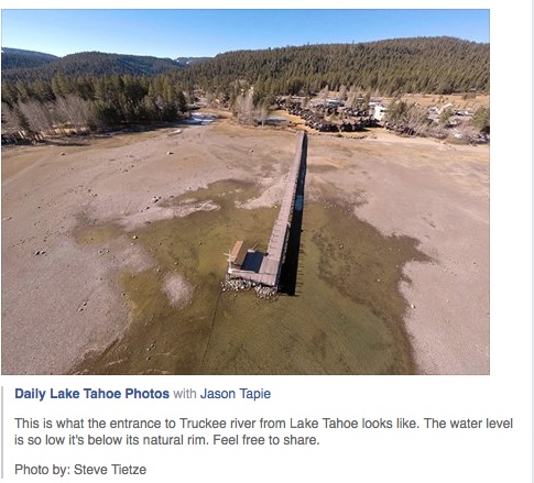Lake Tahoe is a bellwether for the Truckee River. When it drops below its rim, tough times are on the way. As of this post, Tahoe’s dropped 7″ below its rim. A Facebook post from David Bobzien of a photo taken by Steve Tietze underscores the lack of rain and snow. As Tahoe continues to drop it foretells how serious this drought could be. If it persists throughout the winter, Tahoe may not even rise to its rim portending a summer of a practically dry Truckee River. We all need to take this 14 year and continuing drought seriously.