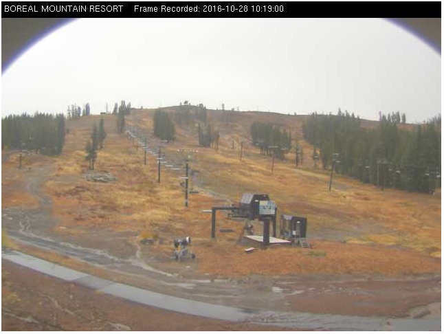 Boreal Ridge Ski webcam screen capture on morning of 10/28/16. Boreal is on the crest of the Sierra Nevada and is just west of the divide between the Truckee River and the South Yuba River.