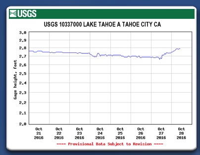 Lake Tahoe once again is seeing a bounce from a wet and warm weather system. As of the morning on Friday, October 28 Tahoe’s elevation has risen about 0.1 feet or just about 1.2 inches. If the rain continues, Tahoe will continue to rise as rain falls directly on the lake as well as additional inflow from streams.