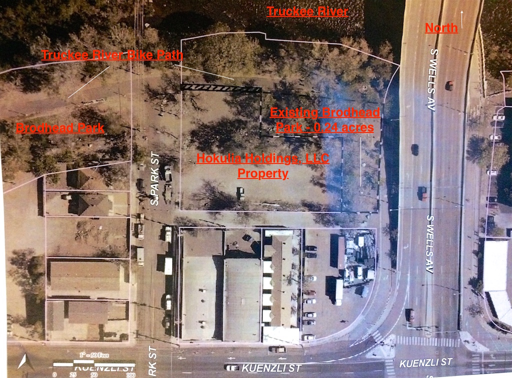 The Reno Recreation and Parks Commission at its November 15 meeting gave its approval in a 5 to 1 vote to transfer 10,650 square feet (0.24 acres) of Brodhead Memorial Park in downtown Reno to Hokulia Holdings, LLC – a developer proposing to build 36 apartment units on both existing private property adjacent to the park and the park land to be acquired from the City. The City of Reno is an advocate for the project which now moves forward. According to Bill Dunne, Revitalization Manager for the City Manager’s Office, they were surprised by the approval, but pleased. Mr. Dunne wrote that “before any property is transferred, or any building begins, there are still multiple step [sic] in the approval process, which will allow for public input.”