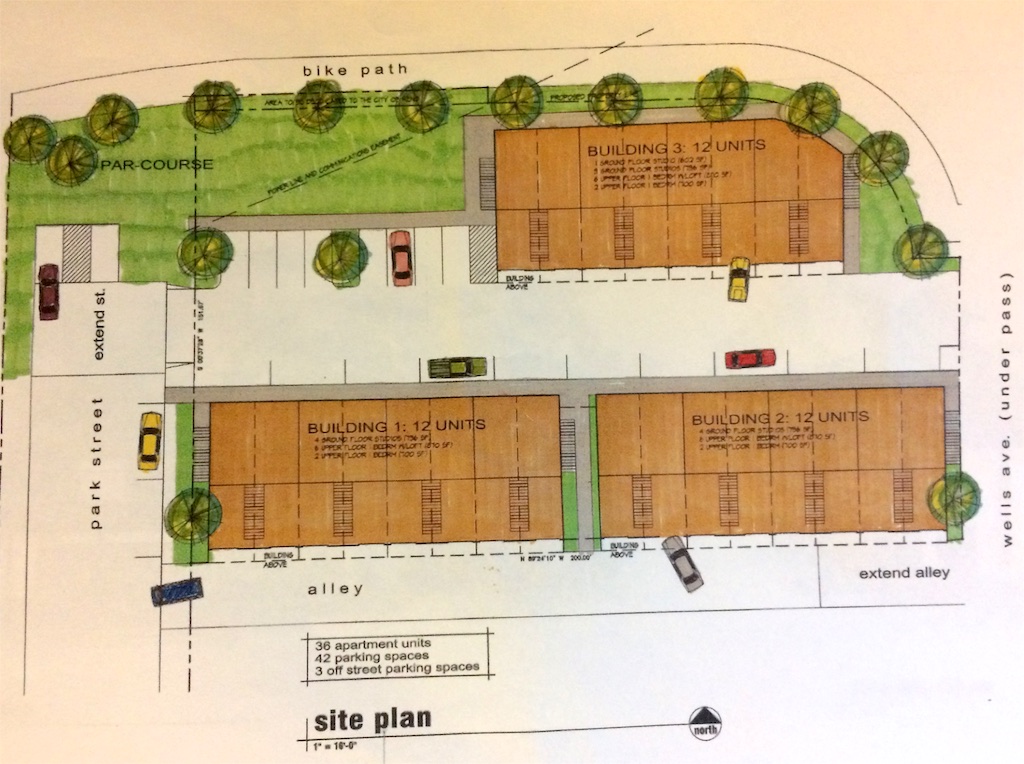The apartment complex is envisioned at this time to have 3 buildings with one adjacent to the existing bike path and just west of Wells Avenue bridge. All site elements at this time are subject to change.