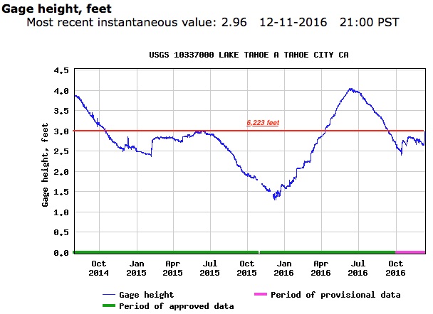 Lake Tahoe as of today is just a little more than 1/2″ from its rim. Water from Lake Tahoe begins to flow into the Truckee River once its elevation reaches 6,223 feet. Lake Tahoe dropped below its rim this summer after rising above its rim in the spring, but has been mostly below its rim since October 2014. (Click graph for full size)