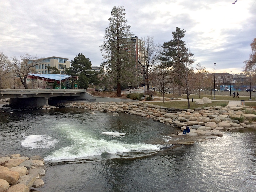 Truckee River in downtown Reno just above the Arlington Street bridge looking west at Whitewater Park.