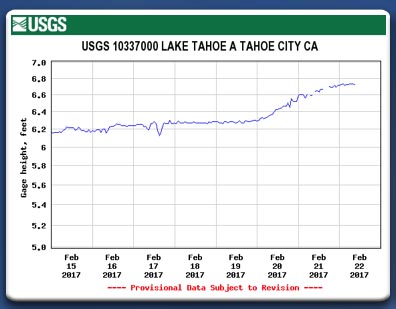 The recent rain storms in Reno and snow and rain in the central Sierra Nevada including Lake Tahoe have raised the Lake’s water surface elevation from 6226.23 to 6226.73 – an additional increase of 5 inches in just 7 days. A significant portion of that rise likely came from rain and snow falling directly on the surface of the Lake. Lake Tahoe occupies 40% of its own watershed. The 5 inch rise is equivalent of 50,933 acre-feet or 16.6 billion gallons of water.The rise is dramatic especially when coupled with the more than 3.5 foot of rise between October 2016 to just before the storms of the past week. Lake Tahoe now stands just 2.37 feet below its maximum water surface elevation of 6229.1 feet (set by court decree). With a current snowpack of more than 200 percent of average, Tahoe seems likely to approach or reach its maximum surface elevation.
