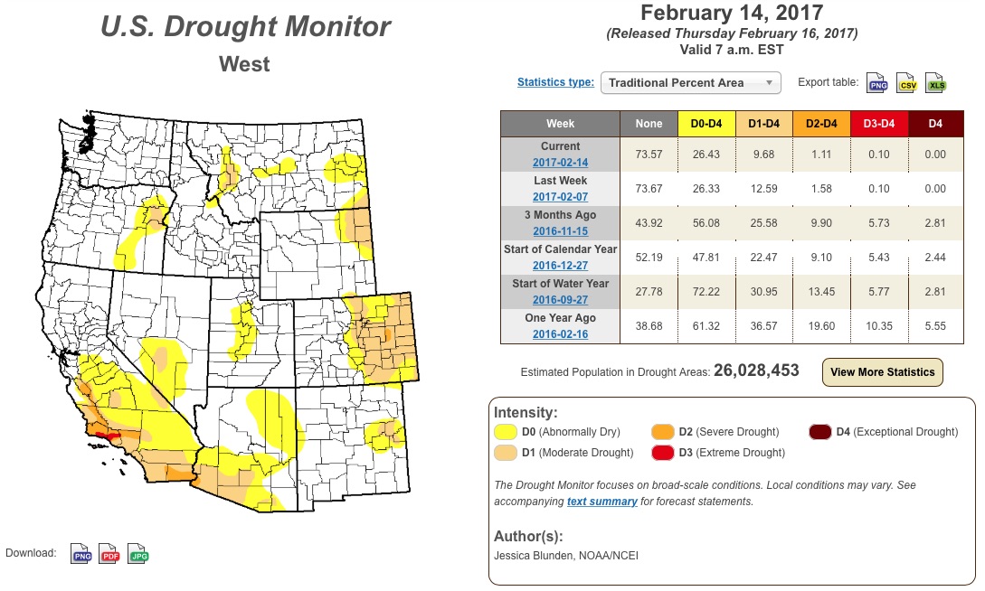 The Drought Monitor map released on February 14 may change yet again from that shown below when next released. Drought conditions in Nevada and California have consistently shrunk in size and severity as rain pummeled California and western Nevada and snow piled up in higher elevations of the Sierra Nevada Mountains.