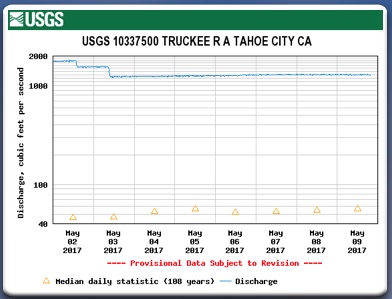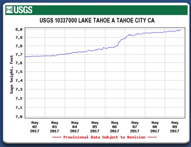 With warming temperatures and the recent rain, Lake Tahoe water surface elevation jumped 3.7 inches in just 7 days with a distinctly rising trend. Releases from Lake Tahoe Dam, controlled by the Federal Water Master, dropped over the past week to around 1,300 cubic-feet-per-second (CFS). The drop in releases from the Tahoe Dam could be to keep the overall flow in the river through Reno-Sparks below 6,000 CFS as flows from tributaries pour into the Truckee River from increasing snowmelt. Even with the reduction of flows from Tahoe, the Truckee River flow is still near 6,000 CFS at Farad, California.