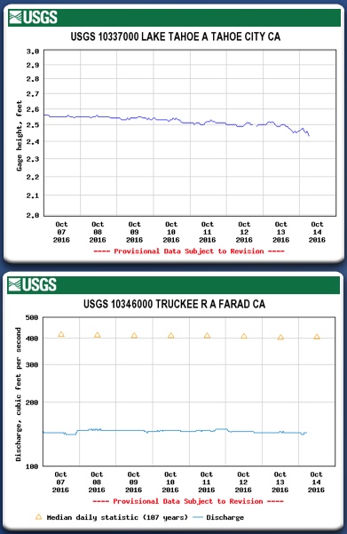 Lake Tahoe’s water level fell to 6,222.5 feet on October 12 or 6 inches below the elevation where water can flow to the Truckee River. Lake Tahoe is the bellwether of the Truckee River. When Tahoe doesn’t have any water to provide to the river, you can bet that the other tributaries are suffering from dry conditions, too. That is certainly the case in 2016 as it was in 2015 and 2014.