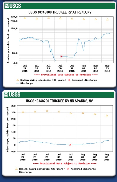 In a first for this century, the Truckee River went dry in Sparks on July 31. It remained at zero flow for around 36 hours, before going up again. What happened? Here you can see a dip in the Reno gauge to just 7 CFS for at least 24 hours between noon on July 30 to noon on July 31. Apparently, the entire flow of the river was then removed at the TMWA Glendale water takeout resulting in no water downstream as measured at the Sparks gauge. (Note: the red * on the graph means that an actual person measured the flow at that site and time.) Truckee River flow recovered at the Reno gauge to 40 CFS by early morning August 1 (followed by a rapid drop to 15 CFS) and today the river at the Reno gauge is nearly 60 CFS. However the Sparks gauge remains just a little better than half of that flow as of 5 PM today.