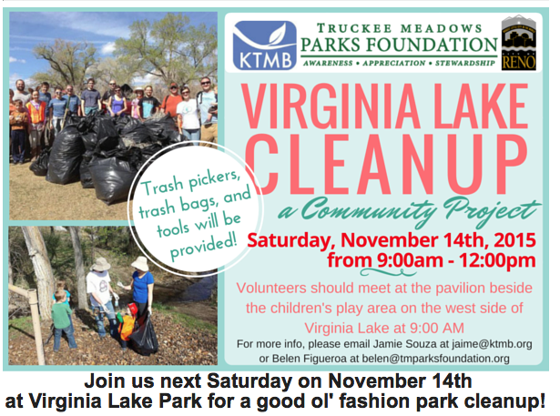 Keep Truckee Meadows Beautiful, the City of Reno, and the Truckee Meadows Parks Foundation are sponsoring a cleanup of Reno’s Virginia Lake Park. Volunteers will be supplied with trash bags and tools. The cleanup lasts until noon; volunteers should meet at 9 AM at the west side of the park in the children’s play area. Contact jaime AT ktmb.org for more information.