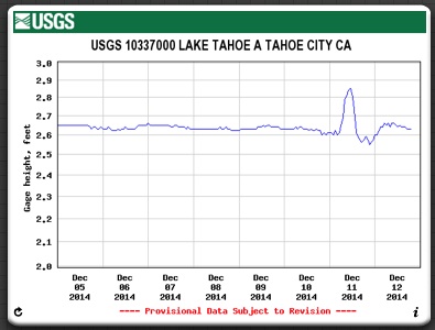 I’m wondering if those strong winds aren’t responsible for the interesting graph of Tahoe’s water elevation that the USGS collects near Tahoe City, CA. First you see a very big increase in the level of the water level (2.4″ rise), followed by a sharp decrease of the water level by an even greater amount, then followed by a slower rise of more than an inch and then a gradual decrease. Could it be that water is being pushed by the wind? Then rolling back as the wind slacks off? I’d be interested to hear from experts on this topic.